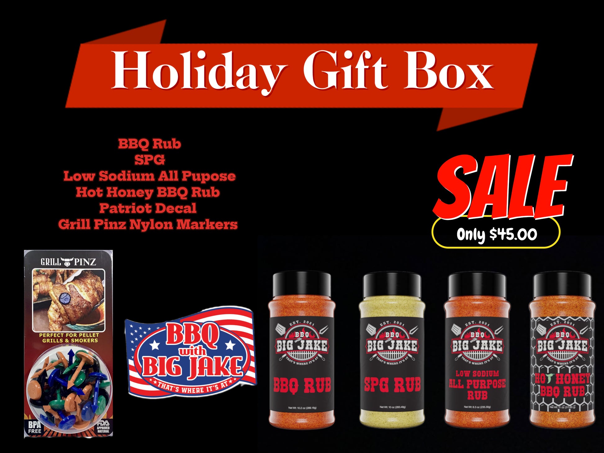 This all - in - one gift box is your one stop shop for that hard to buy for person! Including my "Quadruple Incorporator", Grill Pinz Nylon Pinz (featured in many of my videos), and a BBQ With Big Jake Patriot decal! This package will show up to your door in a nice, discreet box that will be ready to wrap upon delivery! This deal won't last long!